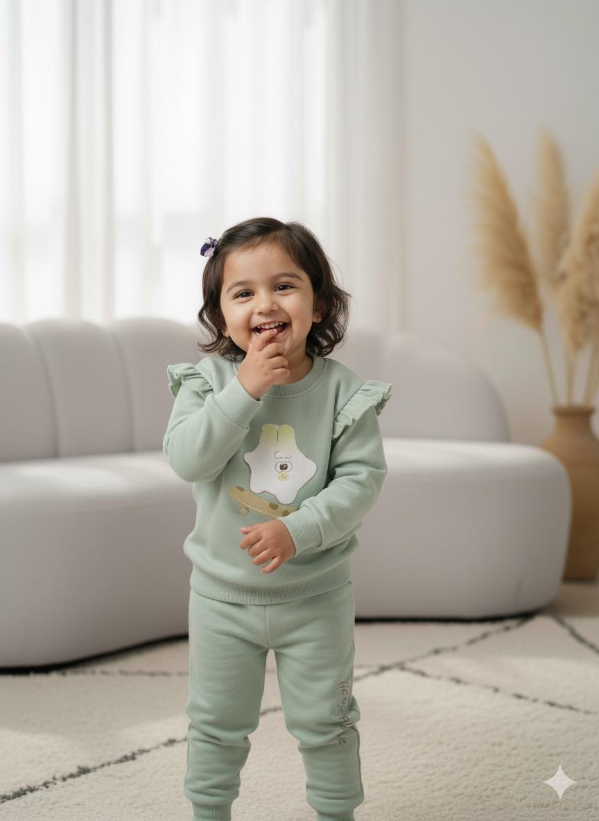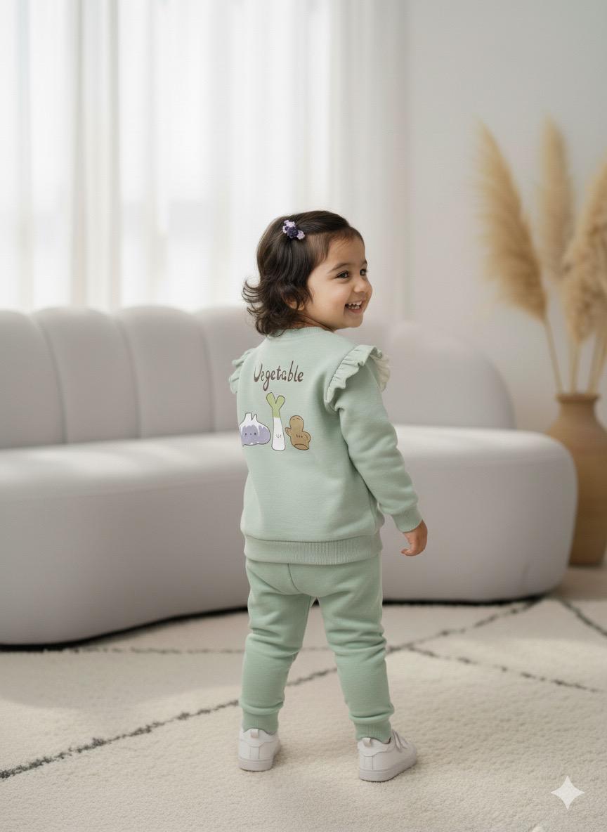 Made from soft, breathable cotton blend fabric, this mint green outfit features a long-sleeve top with ruffle shoulder accents and matching elastic-waist pants. The playful vegetable characters — garlic, leek, and ginger — add a fun and friendly touch, perfect for everyday wear, playtime, or outings.