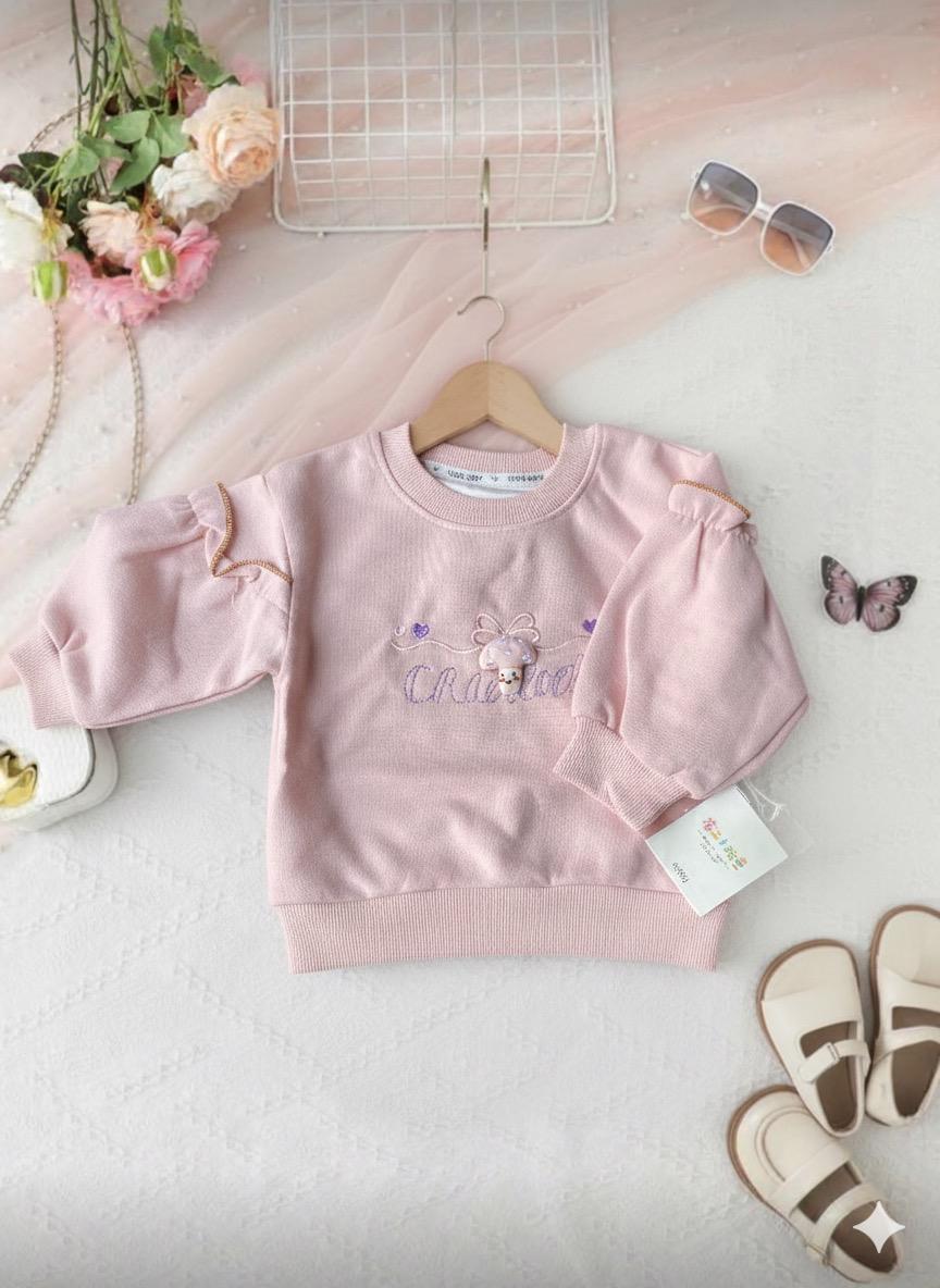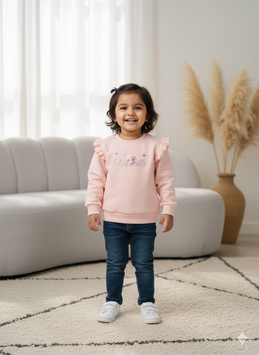 This adorable pink woolen sweater is perfect for your little princess. Made from soft and warm wool fabric, it keeps your baby cozy and comfortable all day long. The puff sleeves with delicate detailing and cute bow-teddy embroidery on the front add a charming touch. Ideal for winter outings, family gatherings, or casual wear.