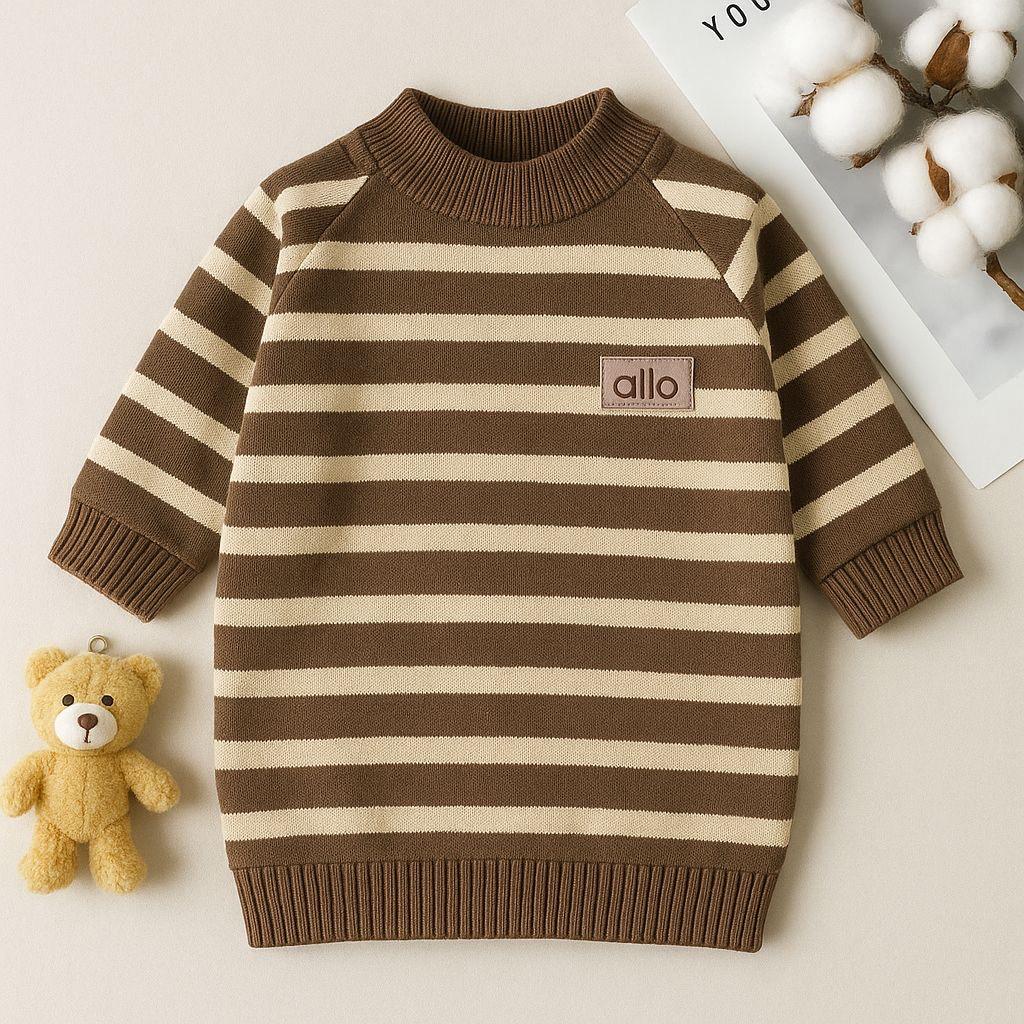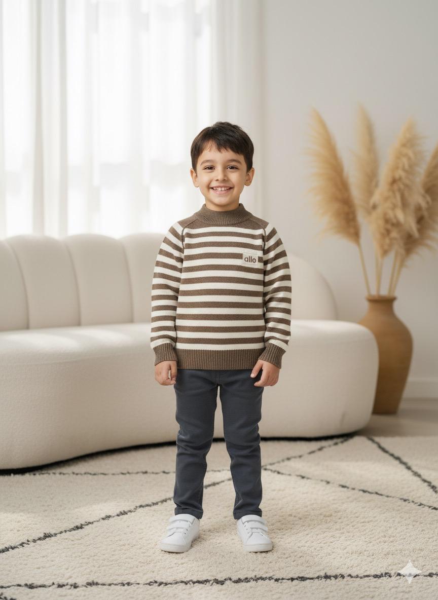 Keep your little one warm and cozy with this soft wool striped sweater. Made from premium-quality wool, it offers excellent warmth and comfort during cold weather. The brown and beige horizontal stripes give it a classic, stylish look, while the ribbed neckline, cuffs, and hem ensure a snug fit. Perfect for everyday wear or casual outings.