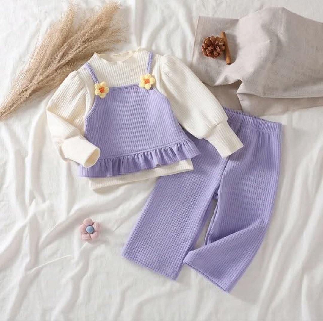 Bottom: Coordinating lavender wide-leg trousers made from the same soft, vertically ribbed material for ultimate comfort and style.