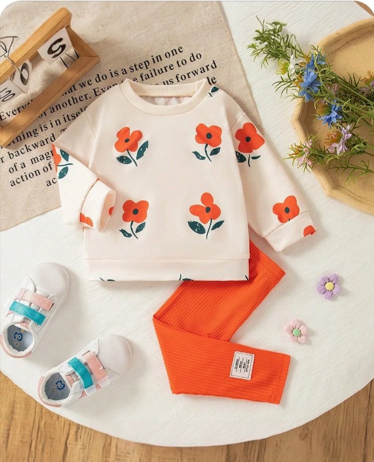 Top: A cream-colored, long-sleeved sweatshirt with a relaxed crew neck. It features an all-over vibrant orange floral print with dark green leafy accents. The ribbed cuffs and hem provide a secure, comfortable fit for active play.